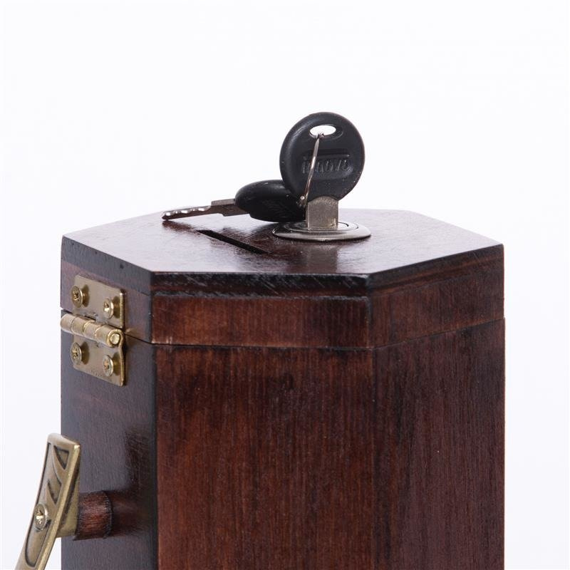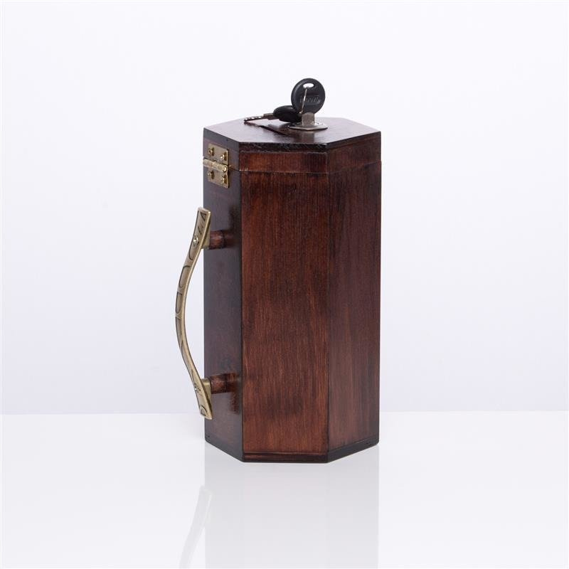 Skarbonka, puszka wykonana z drewna - idealna do zbierania ofiar, datków. Posiada zamykanie na kluczyk. Kolor ciemny brąz.