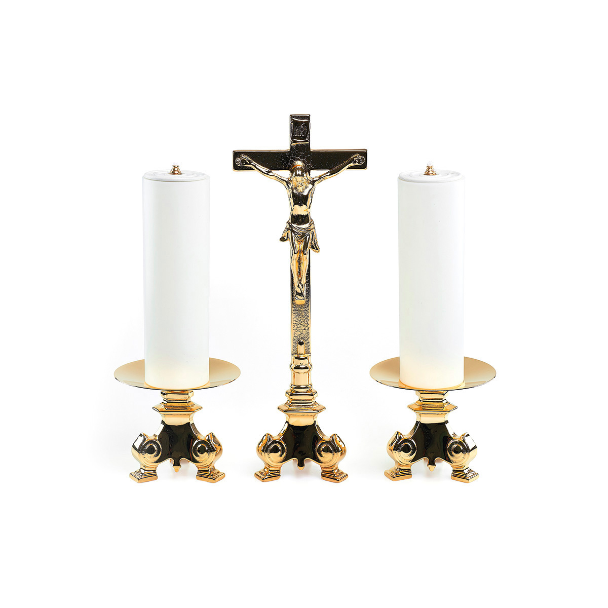 Wzbogać swoje prezbiterium o zestaw, który emanuje majestatem i historycznym pięknem! Nasz komplet ołtarzowy w stylu barokowym to idealne połączenie funkcjonalności i sakralnego splendoru. Wykonany z precyzyjnego mosiężnego odlewu i szlachetnie złocony, stanowi godne uzupełnienie każdej liturgii.